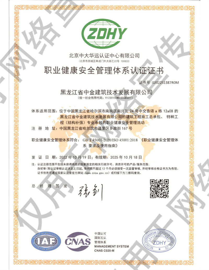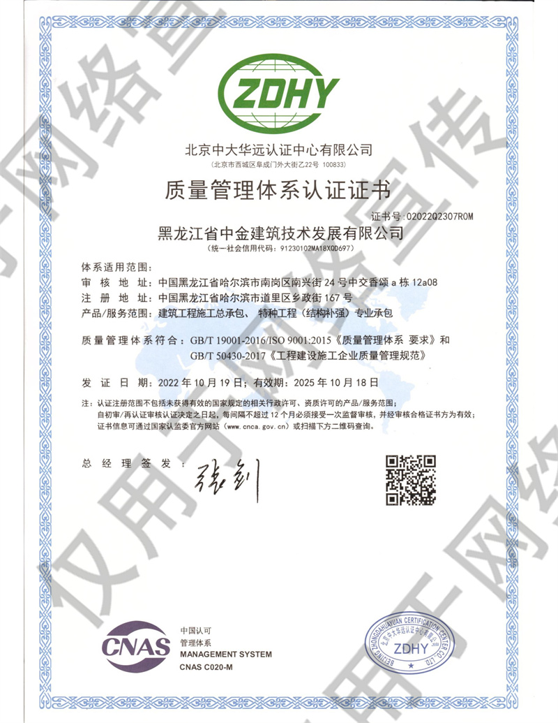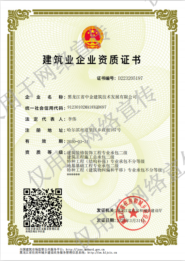 黑龍江省中金建筑技術發展有限公司 是一家具有建筑工程施工總承包三級、地基基礎工程專業承包資質三級(資質證號:D323253666)及特種專業工程專業承包資質及建筑裝修裝飾工程專業承包二級(資質證號:D223205197)。公司營業范圍包括:建筑工程施工、特種工程(結構補強)、特種工程(建筑物糾偏和平移)、建筑裝飾裝修工程。公司成立之初一直服務于既有建筑加固改造行業。來滿足城市建設和舊城市中既有建筑物增層改造、加固補強的需求。主要進行工業和民用建筑房屋、橋梁、古建筑加固改造的檢測、設計和施工。建立了一整套完善的工程管理體系和技術質量體系,制定了專業的企業標準和完善的企業管理制度。公司還擁有一批素質高,經驗豐富的高、中級施工技術人員和數支高素質專業的施工隊伍,施工經驗豐富。