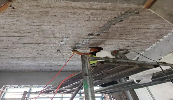 用鑿子、打磨機或高壓水槍清除疏松、剝落的混凝土,直至露出堅實基層。