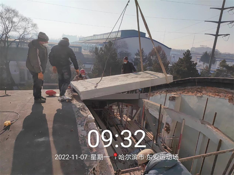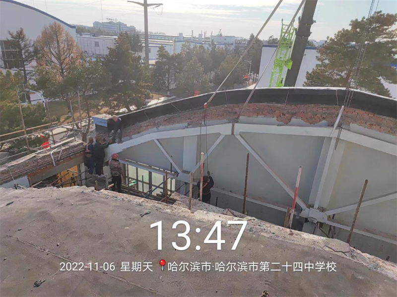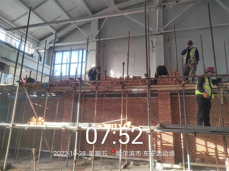 項目位于平房區(qū)保國大街51號中國航發(fā)東安,本工程我公司主要負責5號工房西側(cè)山墻、混凝土預制屋架向廠房內(nèi)側(cè)移位,原狀恢復墻體、框架柱、屋面等相關(guān)結(jié)構(gòu),拆除排氣塔、車庫等附屬設(shè)施。本工程改造的廠房為上世紀五十年代建造,建造年代久遠,我公司在施工全程提供建筑結(jié)構(gòu)的安全性鑒定及建筑改造的施工圖設(shè)計服務(wù)。本工程克服疫情及寒冷天氣施工等多種不利因素的影響,在約定工期內(nèi),保證安全,保證質(zhì)量完成全部施工項目。得到業(yè)主的高度認可,極大的提升了公司的品牌影響力。